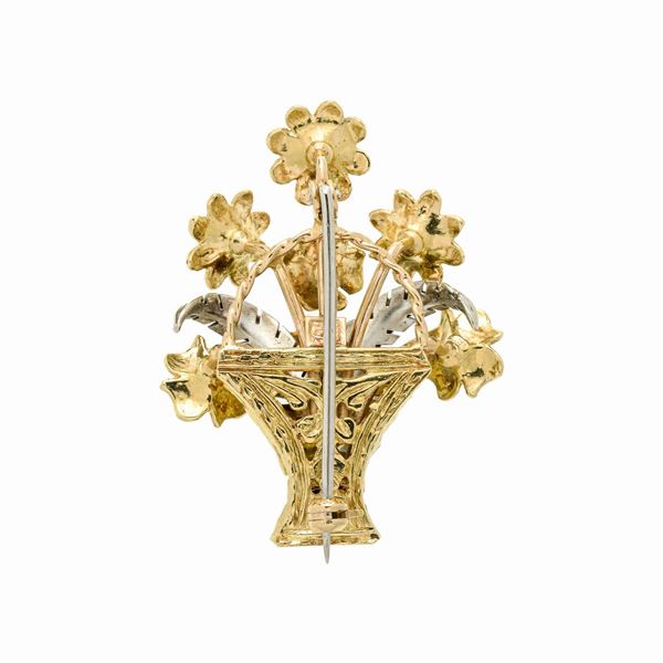 Spilla Cestino in oro giallo, oro bianco, smalti colorati e perle coltivate