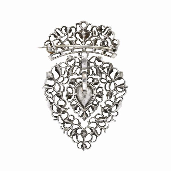 MATERIALE: argeto e diamanti DESCRIZIONE: spilla "Cuore di Fidanzamento" realizzata a tricot, con parte pendente mobile, impreziosita con rose di diamante incassate "a notte" che incorniciano una rosa di diamante più grande disposta al centro MISURE: cm 3.5 x 5.5 h PEESO: gr 14.8
