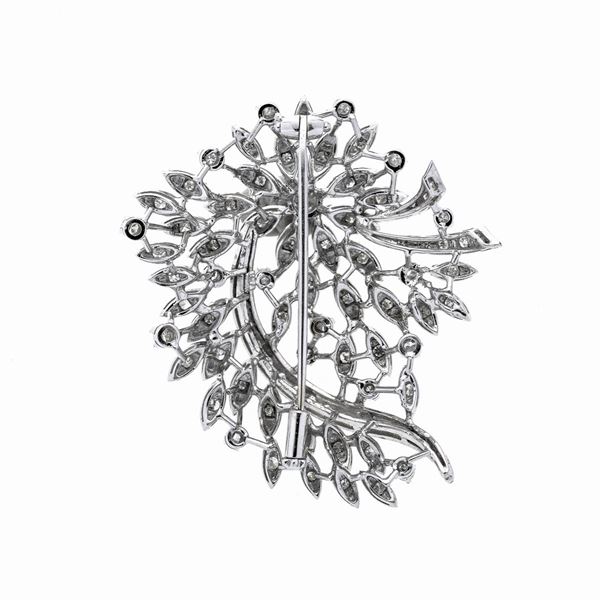 MATERIALE: oro bianco e diamanti DESCRIZIONE: spilla di ispirazione floreale realizzata come un fiore tra grandi foglie interamente impreziosita con diamanti taglio brillante MISURE: cm 4.2 x 4.5h PESO: gr 16.8