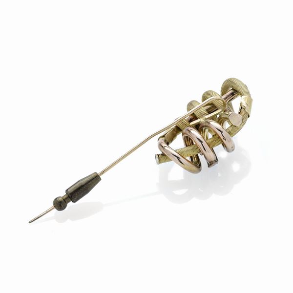 MATERIALE: oro a basso titolo e pietre rosse DESCRIZIONE: spilla di ispirazione geometrica, realizzata come una spirale in parte in oro inciso con motivo a nido d'ape, impreziosita con pietre rosse MISURE: lunghezza cm 7.1 PESO: gr 5.8,