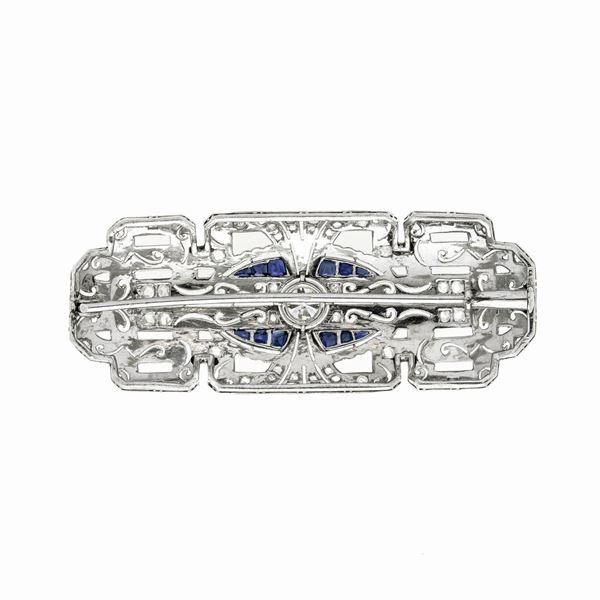 MATERIALE: platino, diamanti e zaffiri DESCRIZIONE: spilla rettangolare, di ispirazione geometrica, realizzata a tricot, con la centro diamante mezzo taglio, impreziosito con rose di diamante e zaffiri taglio carrè MISURE: spilla cm 5.5x 2 h PESO: diamante centrale ct 0.50, J colore, purezza SI, diamanti ct 0.50, gr 12.8