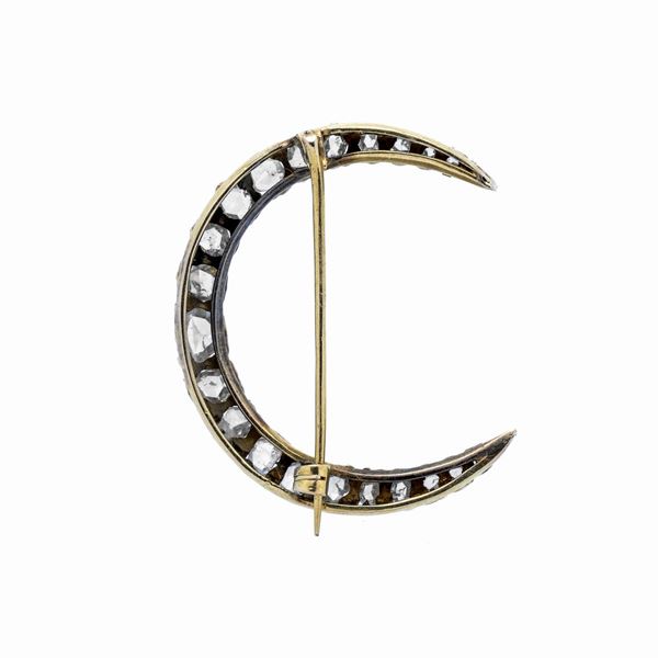 MATERIALE: oro giallo e diamanti DESCRIZIONE: spilla realizzata come una mezza luna interamente impreziosita con rose coronè degradè MISURE: cm 3x4h PESO: diamanti ct 1.80 gr 7.1