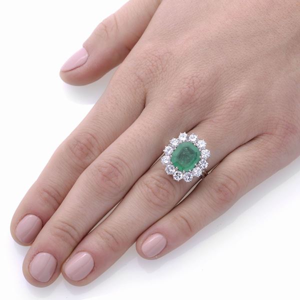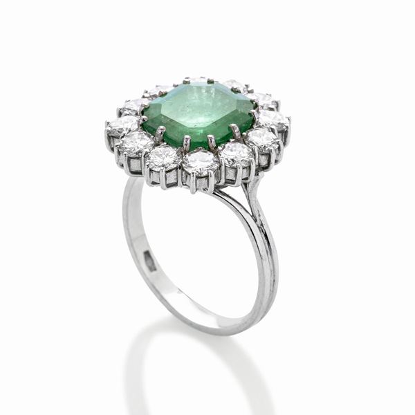 MATERIALE: oro bianco, diamanti e smeraldo DESCRIZIONE: anello a margherita realizzato con smeraldo taglio rettangolare incorniciato con diamanti taglio brillante, reca il marchio 750 MISURE: anello 15 PESO: smeraldo ct 3.60, diamanti ct 1.80, colore G-H, VS, gr 5.7