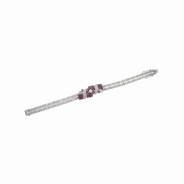 MATERIALE: oro bianco, diamanti e pietre rosse DESCRIZIONE: bracciale realizzato ad imitazione di un nastro, parte centrale con un diamante taglio vecchio, incorniciato con pietre rosse e diamanti, doppio cinturino impreziosito con diamanti taglio huit huit MISURE: aperto cm 18 PESO: diamante huit huit, diamanti ct 1.35 totali, gr 29.4