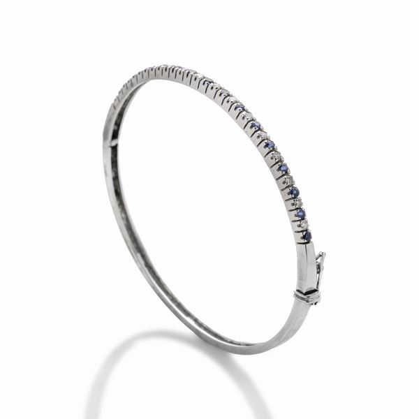 MATERIALE: oro bianco, diamanti e zaffiri DESCRIZIONE: bracciale rigido impreziosito, nella parte superiore, con diamanti taglio brillante alternati a piccoli zaffiri MISURE: chiuso diametro interno cm 5.5 PESO: diamanti ct 0.15, gr 9.7