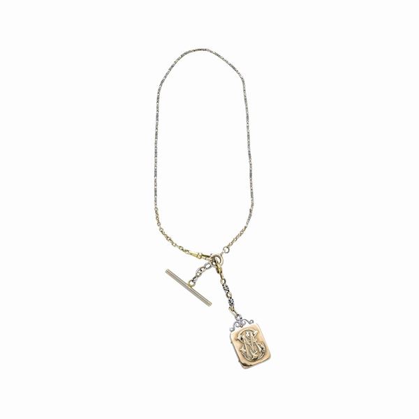 MATERIALE: oro a basso titolo e platino DESCRIZIONE: catena da orologio realizzata in maglie intrecciate tra loro in diversi colori dell'oro, di forme diverse con grande pendente portaritratti, di forma rettangolare, impreziosito da una parte con un'ancora e dall'altra con le iniziali E M, MISURE: aperta cm 38 PESO : gr 29.1