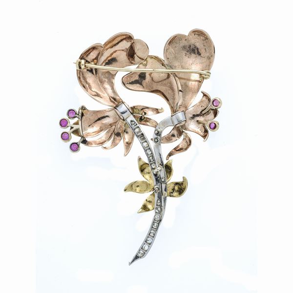 MATERIALE: oro giallo, oro a basso titolo, platino, diamanti e rubini DESCRIZIONE: grande spilla realizzata come un fiore con grandi petali impreziositi con rubini e stelo lumeggiato con diamanti taglio huit huit MISURE: cm 5x 8h PESO: gr 17.4