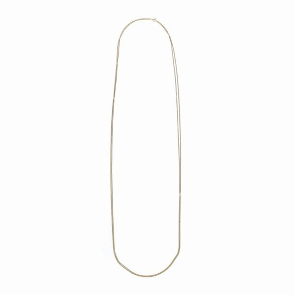 MATERIA: oro giallo 22 kt e oro giallo 18 kt DESCRIZIONE: lunga catena realizzata con piccoli anelli a sezione cava semicircolare saldati insieme per formare una maglia molto fine, questa lavorazione è detta Manin, e fermezza a moschettone, di epoca posteriore in oro 18kt MISURE: lunghezza cm 188 PESO: gr 16.4