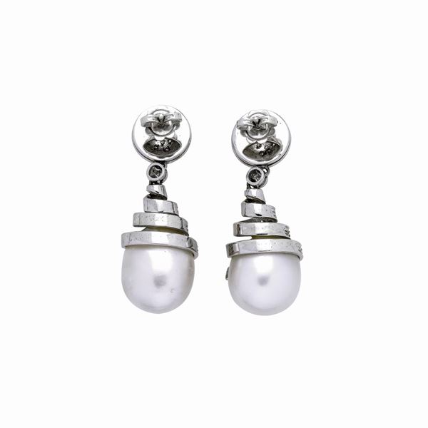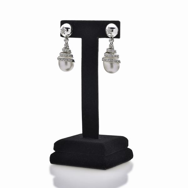 Paio di orecchini pendenti in oro bianco, diamanti e perle coltivate