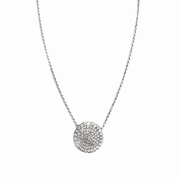 MATERIALE: oro bianco e diamanti DESCRIZIONE: pendente circolare interamente impreziosito con pavè di brillanti, con catena in oro bianco, reca il marchio 750 MISURE: aperta cm 54.5 PESO: diamanti ct 1.0, gr 8.6
