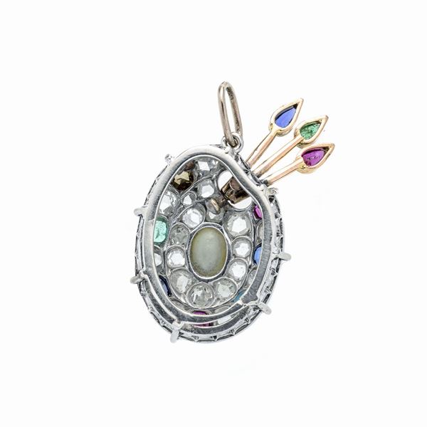 Pendente tavolozza in oro bianco, oro rosa, diamanti, rubini, zaffiri, smeraldi e pietra di luna