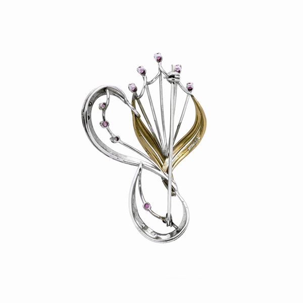 Spilla floreale in oro bianco, oro giallo, diamanti e rubini