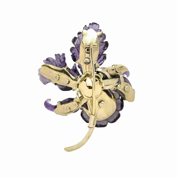 MATERIALE: in oro giallo, oro bianco, diamanti e ametista DESCRIZIONE: spilla realisticamente scolpita come un'orchidea in ametista, impreziosita con diamanti taglio huit huit MISURE: cm 4.3x 5.5h PESO: gr 24.3