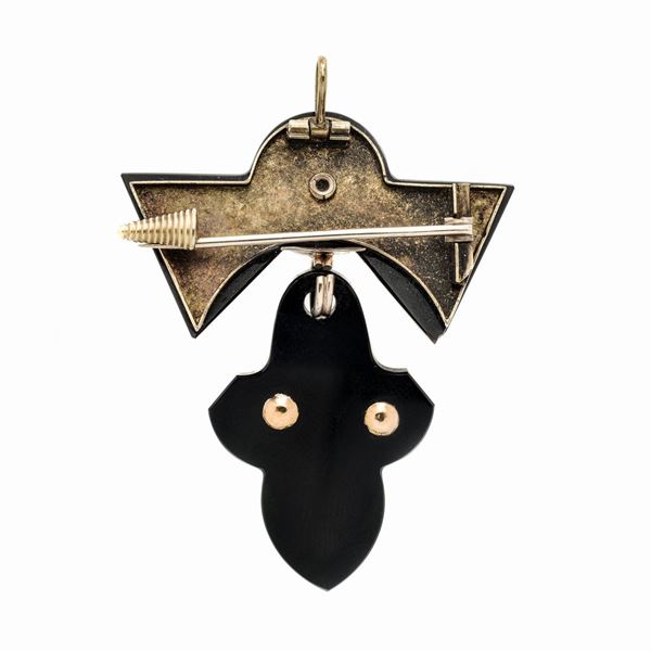 MATERIALE: onice, oro a basso titolo e microperle DESCRIZIONE: spilla pendente realizzata come un fiocco stilizzato con parte pendente che ricorda un cartiglio impreziosita con microperle MISURE: cm 4.0 x 5.1h PESO: gr 13.9