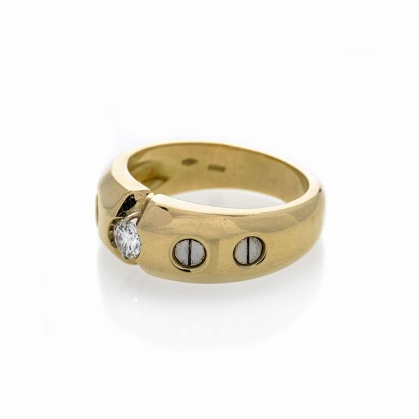 MATERIALE: oro giallo e diamante DESCRIZIONE: anello a fascia, leggermente bombata, impreziosito con diamante taglio brillante, reca il marchio 750 MISURE: anello 20 PESO: diamante ct 0.30, gr 13.3