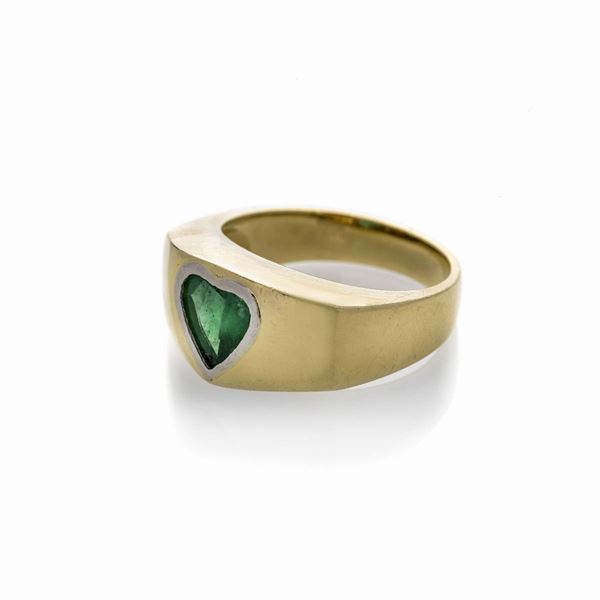MATERIALE: oro giallo e smeraldo DESCRIZIONE: anello a fascia, leggermente bombata, realizzato con smeraldo taglio a cuore, reca il marchio 750 MISURE: anello 11 PESO: smeraldo ct 0.87, gr 8.8