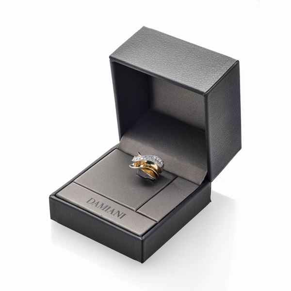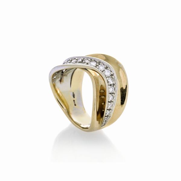 MATERIALE: oro giallo, oro bianco e diamanti DESCRIZIONE: anello realizzato come una fascia sagomata, impreziosita con pavè di brillanti su oro bianco, firmato 'Salvini' di difficile lettura, reca il marchio 750 MISURE: anello 13.5 PESO: gr 10.7
