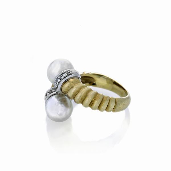 MATERIALE: oro giallo, oro bianco, diamanti e perle coltivate DESCRIZIONE: anello contrariè realizzato con due perle coltivate impreziosite, su ciascun lato, da pavè di brillanti e fascia realizzata come una cornucopia, reca il marchio 750 MISURE: anello 12.5 PESO: diametro perle mm 8, gr 10.1