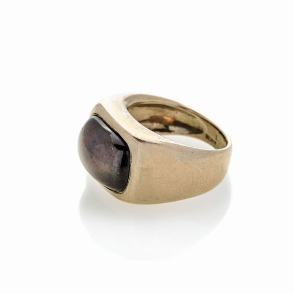 MATERIALE: oro a 9kt e granato DESCRIZIONE: anello realizzato con granato taglio cabochon ovale al centro su alta base leggermente bombata, reca un punzone di difficile lettura MISURE: anello 12 PESO: granato ct 7.5, gr 9.6