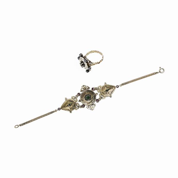 Bracciale e anello in oro a basso titolo, microperle, rubini, smeraldi e zaffiri