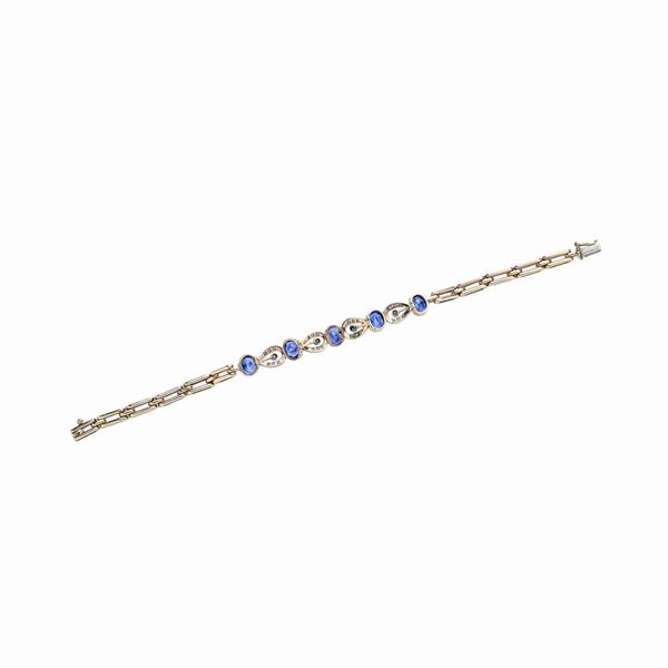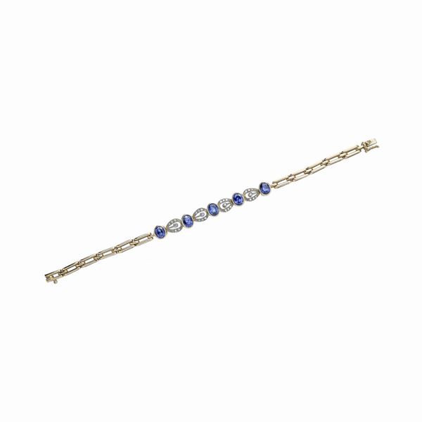 MATERIALE: oro giallo, diamanti e zaffiri DESCRIZIONE: bracciale a maglie rettangolari intrecciate tra loro realizzato, nella parte centrale, con cinque zaffiri tra foglie stilizzate impreziosite con diamanti taglio brillante e cinturino a maglie intrecciate in oro giallo, firmato 'Mador', reca il marchio 750 MISURE: bracciale aperto cm 18.7 PESO: gr 19.2
