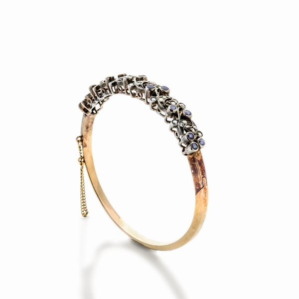 Bracciale rigido in oro giallo, argento, diamanti e zaffiri