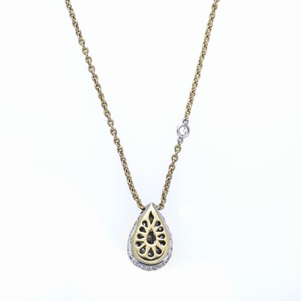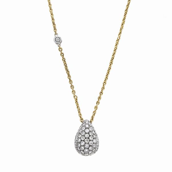 MATERIALE: oro giallo e diamanti DESCRIZIONE: catena realizzata a maglie intrecciate con pendente modellato come un uovo impreziosito, nella parte anteriore, da pavè di diamanti, reca il marchio 750 PESO: diamanti ct 2.0, colore H, purezza VS, gr 10.3