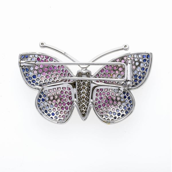 Clip Farfalla in oro bianco, diamanti, diamanti brown, zaffiri e zaffiri rosa