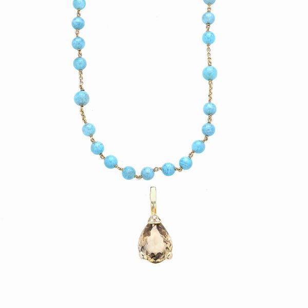 Collana in oro giallo e calcedonio azzurro con pendente in oro giallo, diamanti e quarzo citrino