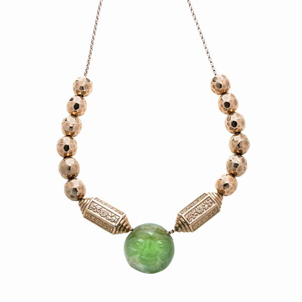 MATERIALE: oro rosa 9kt, oro giallo e smeraldo DESCRIZIONE: collana realizzata a maglie intrecciate, impreziosita con amuleto scolpito come un volto sorridente tra due barilotti esagonali incisi con fiori e sfere sfaccettate, la fermezza reca il marchio 750 MISURE: collana aperta cm 41.8 PESO: gr 25.4