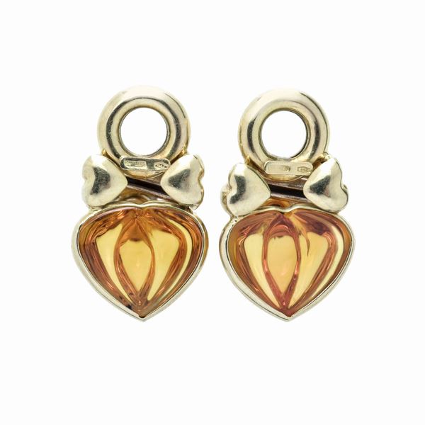 MATERIALE: oro giallo, rubino e resina DESCRIZIONE: coppia di pendenti ciascuno realizzato ad imitazione di un 'Nodo d'Amore' con cuore in resina baccellata impreziosita, nella parte superiore, con rubino taglio cabochon, recano il marchio 750 MISURE: cm 1.8x 2.9h PESO: rubini ct 0.30, complessivi gr 11.4