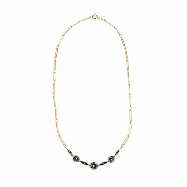 MATERIALE: oro giallo, argento e diamanti DESCRIZIONE: girocollo realizzato con lunghe maglie rettangolari intrecciate tra loro e parte centrale in argento, imprezosita con rose di diamante, una piccola rosa mancante, reca il marchio 750 MISURE: girocollo aperto cm 39.9 PESO: gr 8.9
