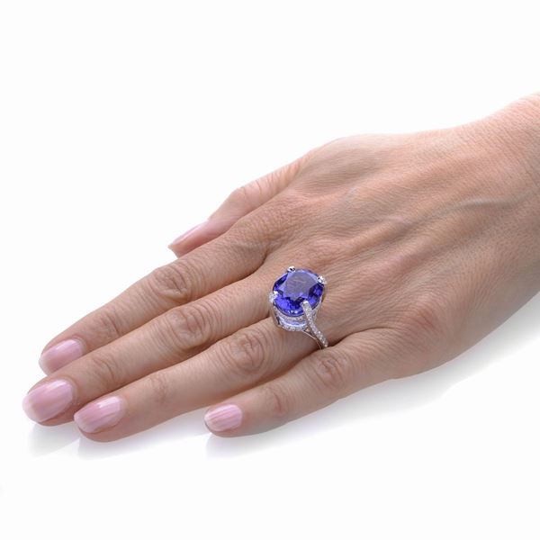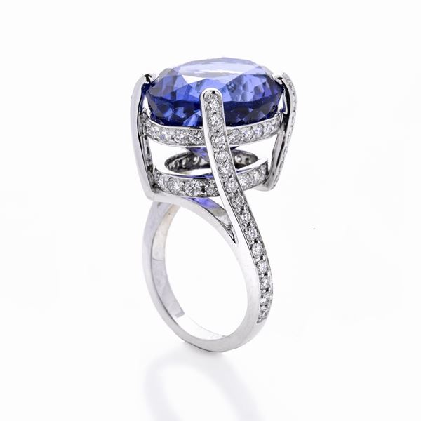 MATERIALE: oro bianco, diamanti e tanzanite viola-blu PESO: grande anello realizzato con tanzanite ovale montata con quattro griffe interamente impreziosite, lateralmente, sulla base e sull'anello con diamanti taglio brillante, reca il marchio 750 MISURE: anello 13 PESO: tanzanite ct 18.50, diamanti ct 1.0 circa, colore G/H, purezza VS, gr 13.1