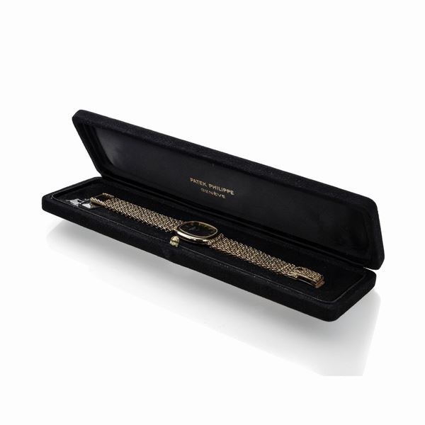 MATERIALE: oro giallo e lapislazzulo DESCRIZIONE: orologio da polso con ghiera liscia, quadrante ovale in lapislazzulo, indici in oro giallo, lancette a bastone, movimento a carica manuale, cinturino a maglie in oro giallo, ad imitazione del tessuto, firmato Patek Philippe, reca il marchio 750, corredato di scatola originale MISURE: quadrante mm 27, cinturino aperto cm 16 PESO: gr 63.7