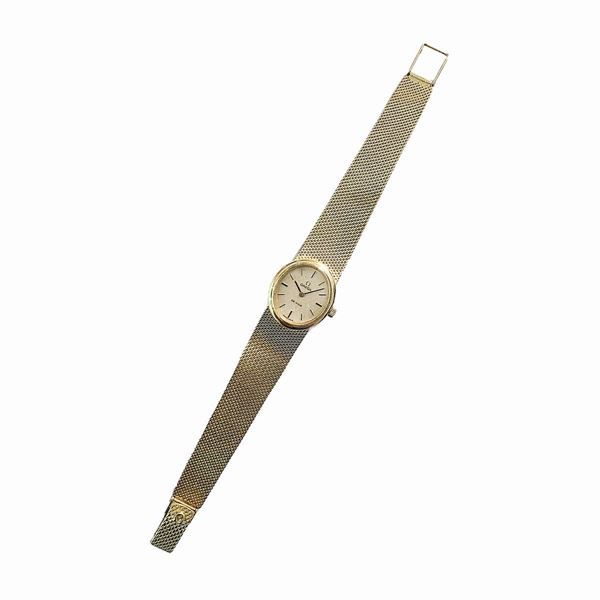 MATERIAE: oro giallo DESCRIZIONE: orologio da polso con ghiera liscia, quadrante ovale champagne con indici in oro, lancette a bastone, movimento a carica automatica, cinturino in oro giallo, ad imitazione del tessuto, firmato Omega, reca il marchio 750 MISURE: quadrante mm 21, aperto cm 16 PESO: gr 39.9
