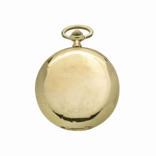 MATERIALE: oro giallo DESCRIZIONE: orologio da tasca con doppia cassa in oro giallo, quadrante in smalto bianco con numeri arabi, quadrante supplementare ad ore 6, lancette douphine in materiale luminescente blu, movimento a carica manuale, reca il marchio 18 kt MISURE: diametro mm 45 PESO: gr 57.5