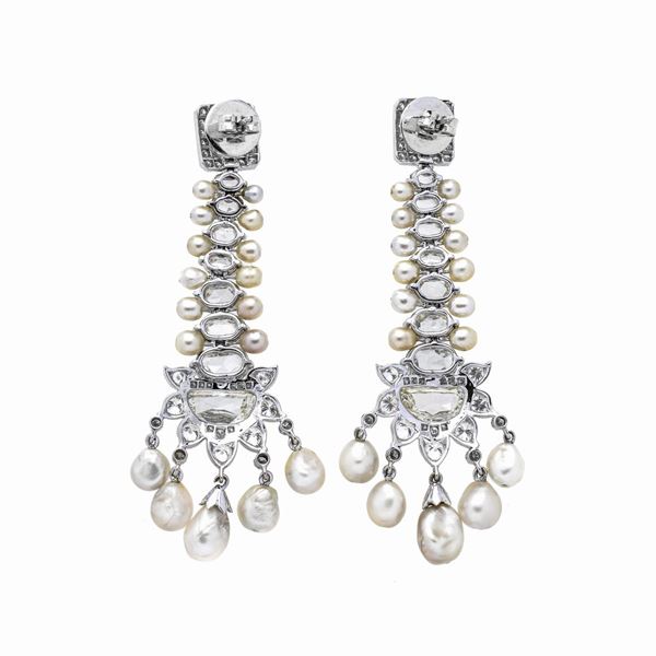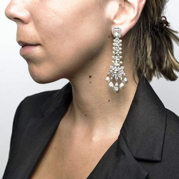 Paio di lunghi orecchini pendenti in oro bianco, diamanti e perle