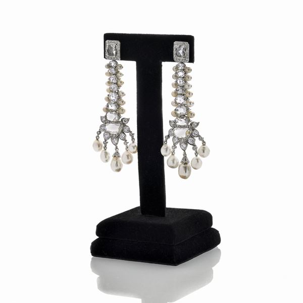 MATERIALE: oro bianco, diamanti e perle DESCRIZIONE: paio di lunghi orecchini pendenti, ciascuno realizzato con clip con diamante ovale taglio rosa coronè incorniciata da diamanti taglio brillante, parte centrale con otto diamanti ovali taglio rosa coronè degradè, impreziositi con perle di varie misure e diamanti taglio brillante sulla base, con cinque perle pendenti PESO: diamanti ct 8.0 ca, gr 22.20