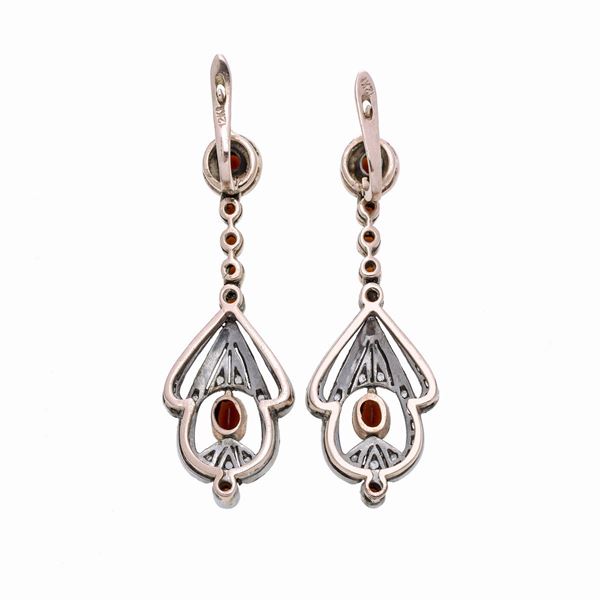 Paio di orecchini pendenti in oro a basso titolo, argento, granati e diamanti