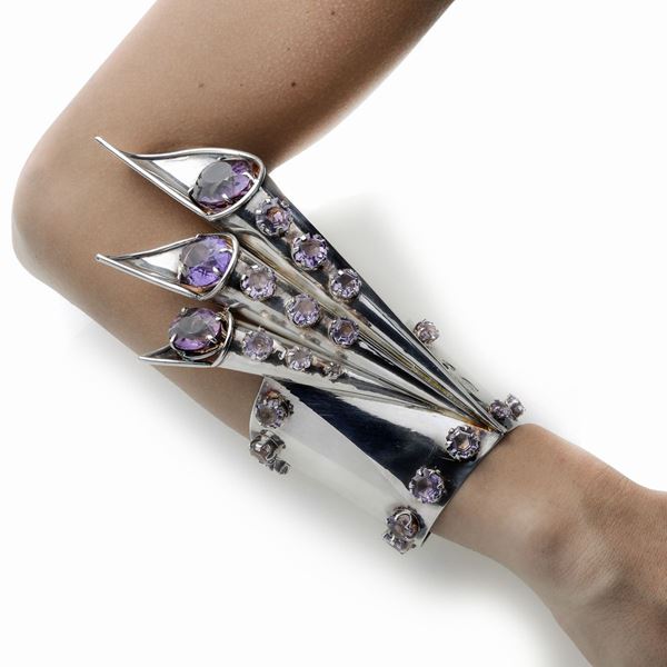 MATERIALE: argento e ametista DESCRIZIONE: particolare Manchette, di ispirazione geometrica, realizzata con tre cornucopie stilizzate impreziosite con ametiste, queste ultime le ritroviamo lungo tutto il perimetro del bracciale, firmato 'Gino Gino by Pasini', reca i marchi 506 VI e 925 MISURE: cm 5.8x 16.5h PESO: gr 179.3