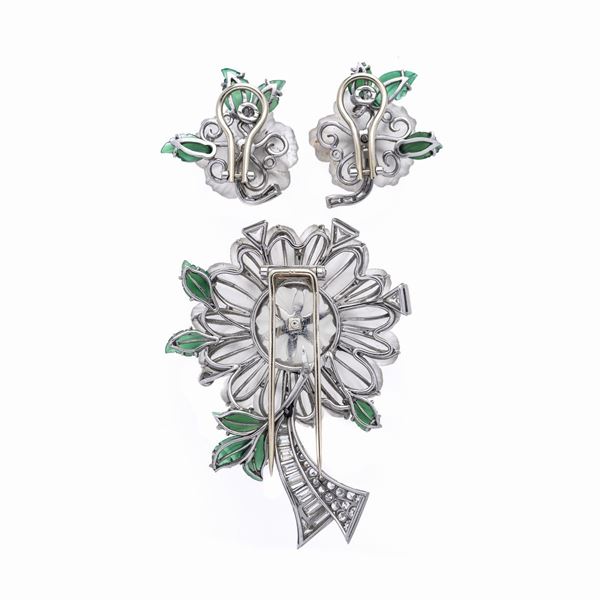 MATERIALE: oro bianco, cristallo di rocca, pietra verde e diamanti DESCRIZIONE: parure composta da grande spilla realizzata come un fiore in cristallo di rocca inciso, impreziosito con diamanti taglio brillante al centro, questi ultimi li ritroviamo anche nel gambo, sia di taglio brillante, di taglio huit huit che di taglio baguette, foglie in pietra verde, paio di orecchini a clips en suite MISURE: spilla cm 5 x 6.5 h, orecchini cm 2.5 x 3.5 h PESO: diamanti ct 3.50 circa, colore H, purezza VS-SI, gr 66.3