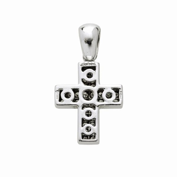 MATERIALE: oro bianco e diamanti DESCRIZIONE: pendente croce interamente impreziosito con pavè di diamanti, firmato 'Salvini', reca il marchio 750, corredato di scatola originale MISURE: cm 1.8x 2.0h PESO: gr 5.9