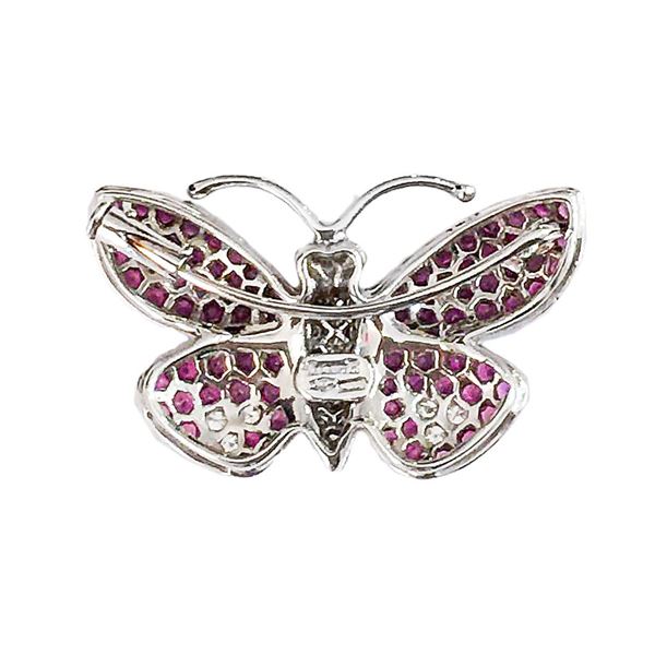 Spilla farfalla in oro bianco, diamanti brown e rubini
