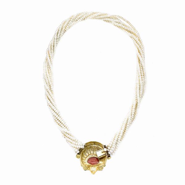 MATERIALE: perle, oro giallo, diamanti, corallo e smaraldi DESCRIZIONE: collana a torchionne realizzata con sei fili di perle e grande fermezza centrale in oro giallo raffigurante divinità con copricapo impreziosito da grande corallo taglio cabochon al centro, diamanti taglio brillante e smeraldi, reca il marchio 750 MISURE: collana aperta cm 47.3 PESO: diametro perle mm 3.4, gr 67.0