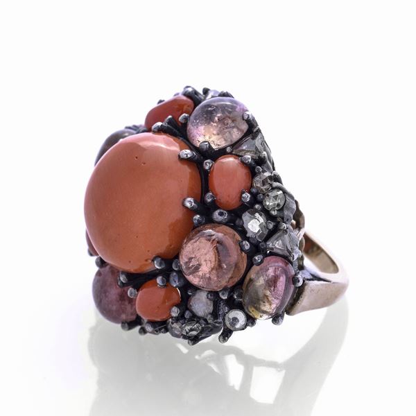 Grande anello in oro a basso titolo, argento, corallo rosso, quarzo rosa e diamanti