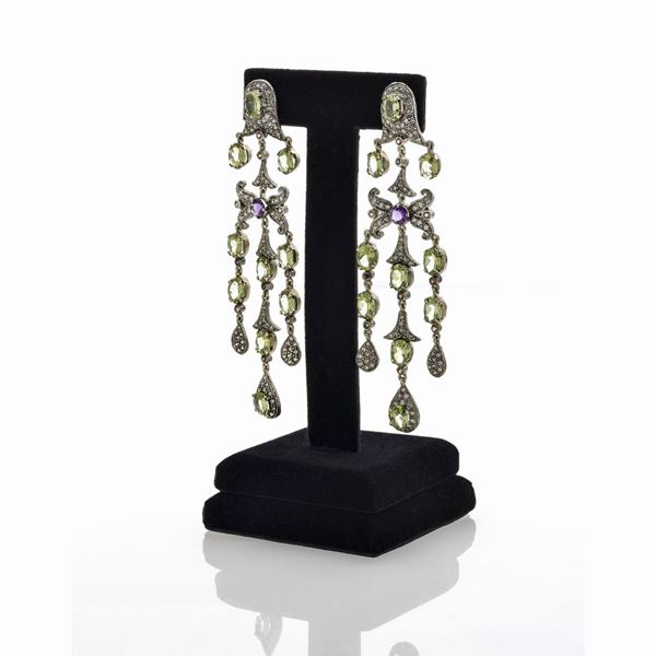 MATERIALE: oro a basso titolo, argento, diamanti, peridoti verdi e ametista DESCRIZIONE: lunghi orecchini pendenti a candelabro ciascuno realizzato con peridoti verdi taglio ovale e diamanti taglio brillante e huit huit MISURE: cm 2.0x 9.0h PESO: complessivi gr 22.9
