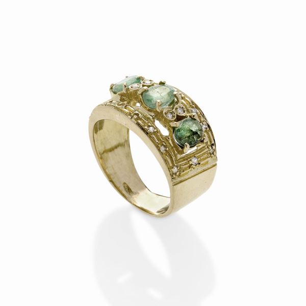 Anello a fascia in oro giallo, diamanti e smeraldi