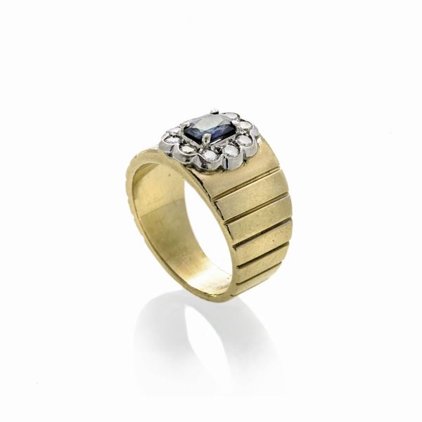 Anello a fascia in oro giallo, oro bianco, diamanti e zaffiro