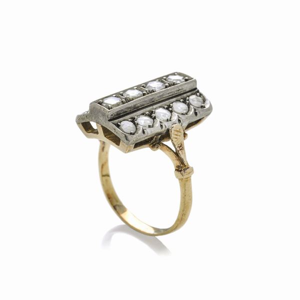 Anello a losanga in oro giallo, argento e diamanti