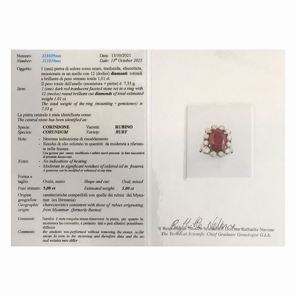 MATERIALE: oro bianco, diamanti e rubino Birmano naturale non trattato DESCRIZIONE: anello a margherita realizzato con rubino taglio ovale misto incorniciato con diamanti taglio brillante MISURE: l'anello presenta un ferma anello smontabile 7 PESO: rubino ct 5.0, diamanti ct 1.01, corredato di certificato RAG, numero J21039MN del 13.10.2021, gr 7.33